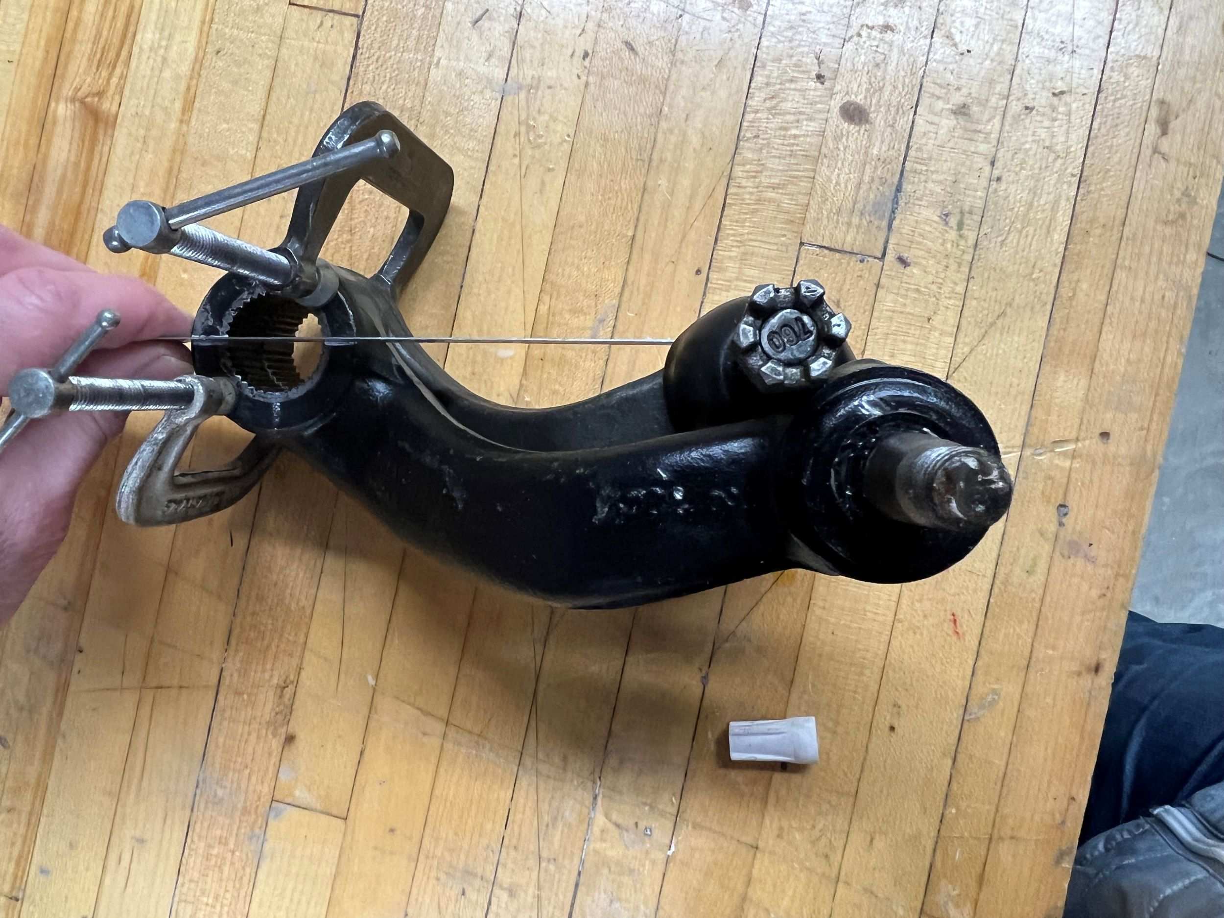 After doing all this research I came to conclusion that the longer pitman arm needed to move one tooth on the steering box to the left as it was installed in the car. All the other reference marks, from the steering wheel to the teeth on the steering box all lined up per the factory shop manual and documentation on this forum and others as well as advice from Carmin. I came to this conculsion from the photo of the arms. If you look at the spline they are lined up (short arm to long arm). the white chalk mark on the arm should be parallel to the drag link. If you look at this photo clearly the pitman arm is at a different angle than the shorter arm.
