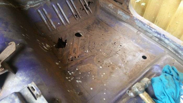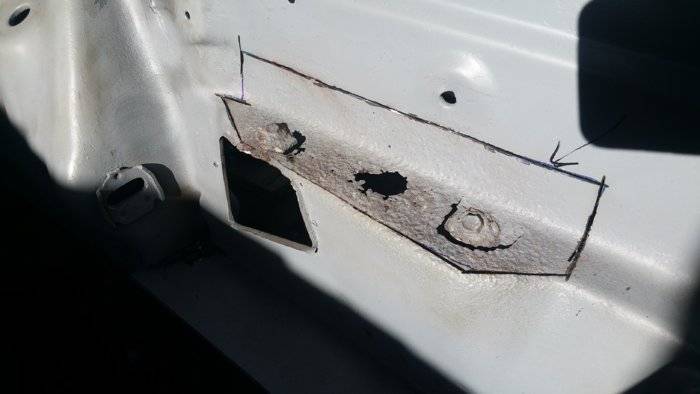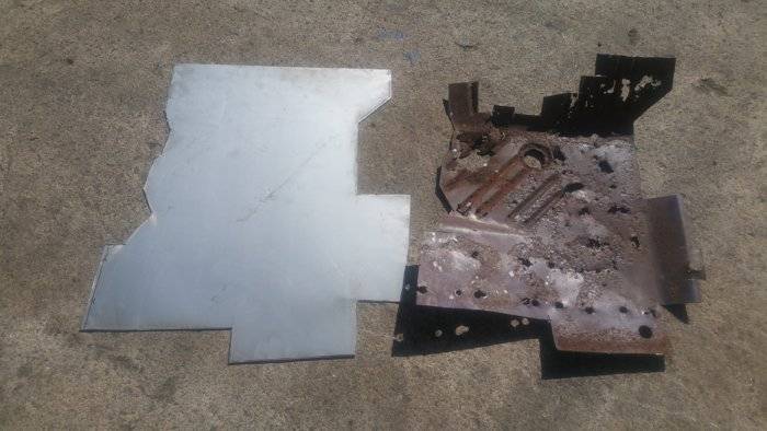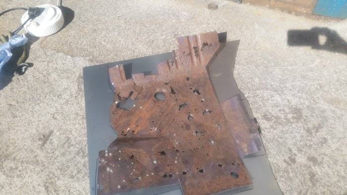 Since few days I moved towards the front floor pans. With all the spot welding drilled and the rotten flooring cut and removed, I made a cardboard template to reproduce the shape.