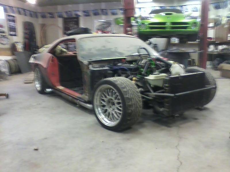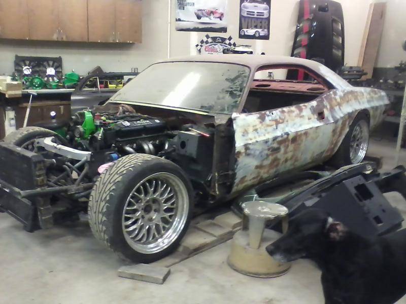O.K. I'll spill the beans. I had a 70 340 Challenger I bought many years ago for parts. It was really rusty so I never thought about "saving" it. Time goes on, it's sitting out back in the weeds next to a wrecked Viper frame......... I walk by one day a light bulb comes on. So, one nite sitting at the computer I start looking up dimensions, etc. The floor pan width of the E-body is the same width as the Viper. The Challenger is 14" longer than the Viper. I had enough frame parts to put a lengthened frame together and sit the Challenger body on it.