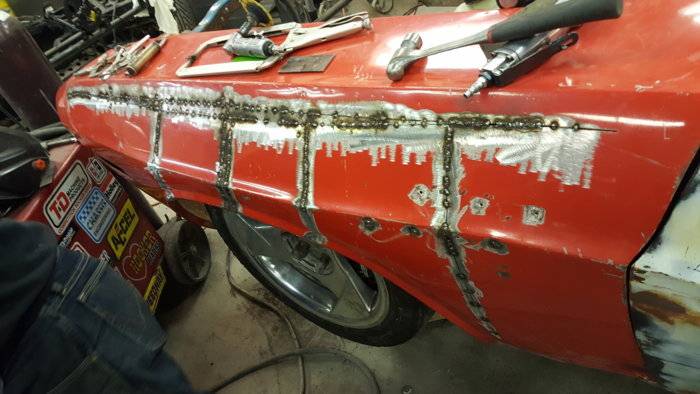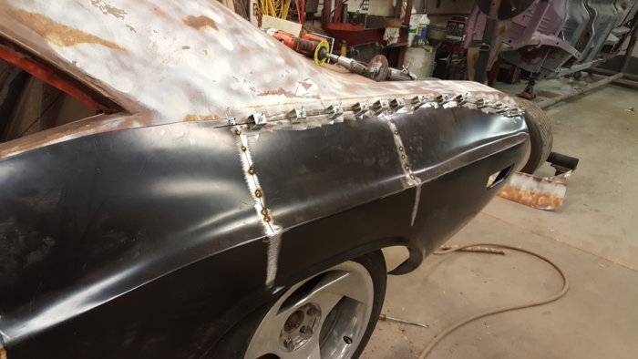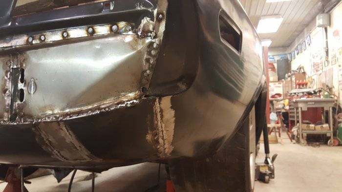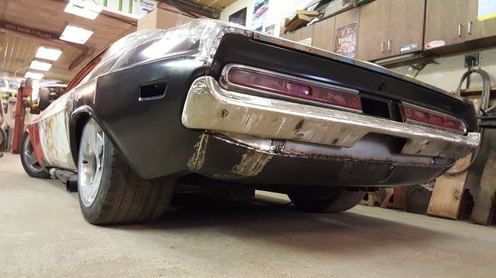 Got the tail wrapped up in the last couple days. Got the bumper fitted with new brackets and holes filled. Had to lengthen the Viper frame rails 3"to reach the back panel of the Challenger trunk. Welded a filler panel in between the t-light panel and the valence. Might add on to the bottom of the bumper to get a better "finished" look and fit. Welded the valance in to the bottom of the quarters too. That joint was really bad. Looks good now tho. :) And, the deck lid even fits!!!!