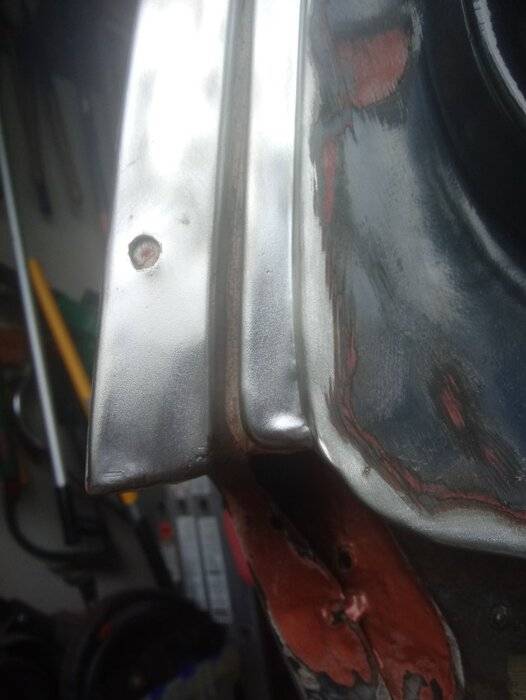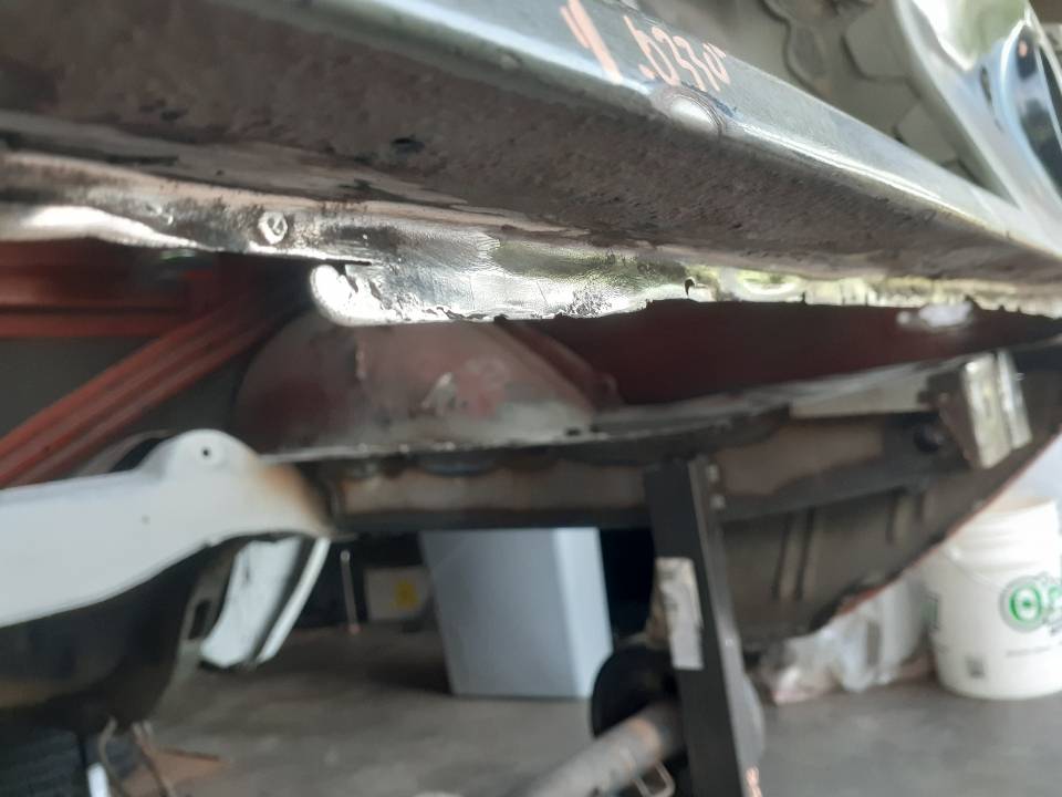 Rear lip of the floor pan sitting flush with the bottom tail light panel. You can see holes where some new metal needs to be added.