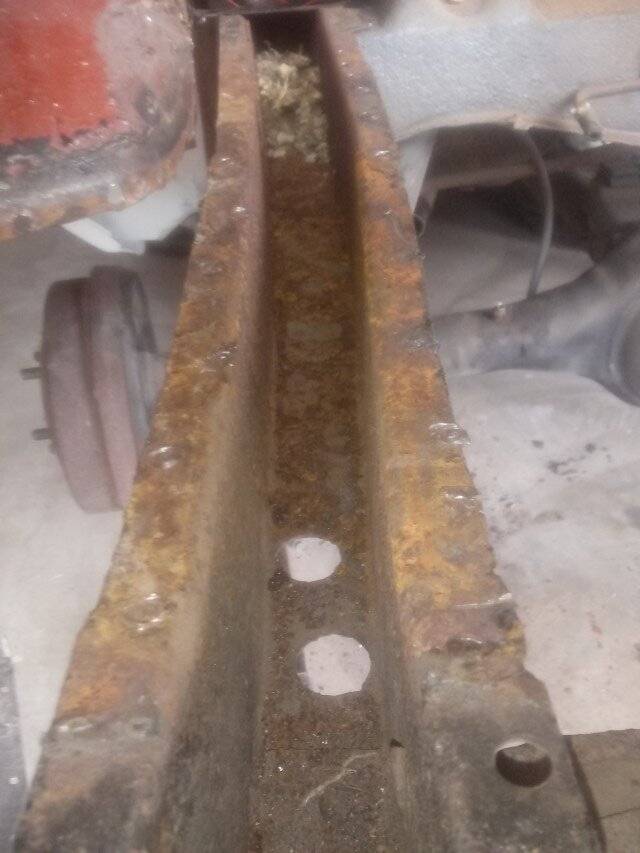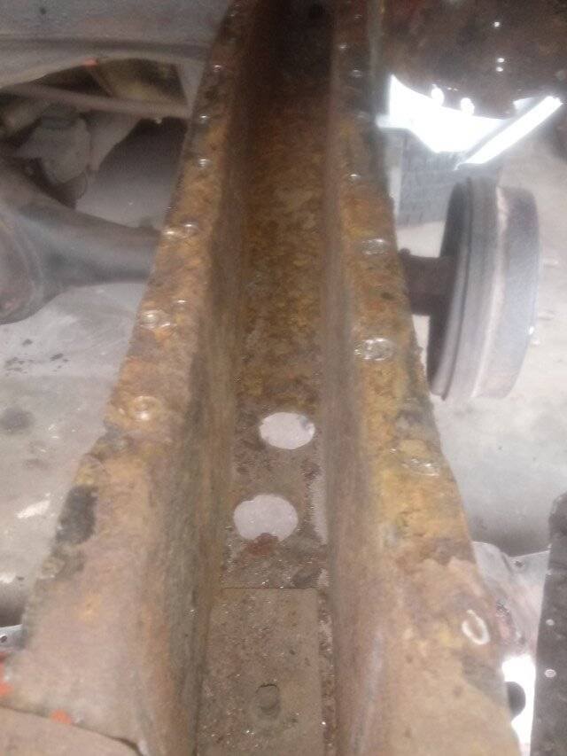 Here are some pictures of the rear frame rails. It looks like there is some pitted rust in the rails. Some spots are thin from the rust, and there are some pin holes on the walls. There are some patches on the walls where a plate was welded over what were likely much larger holes. However, the rail feels very sturdy.