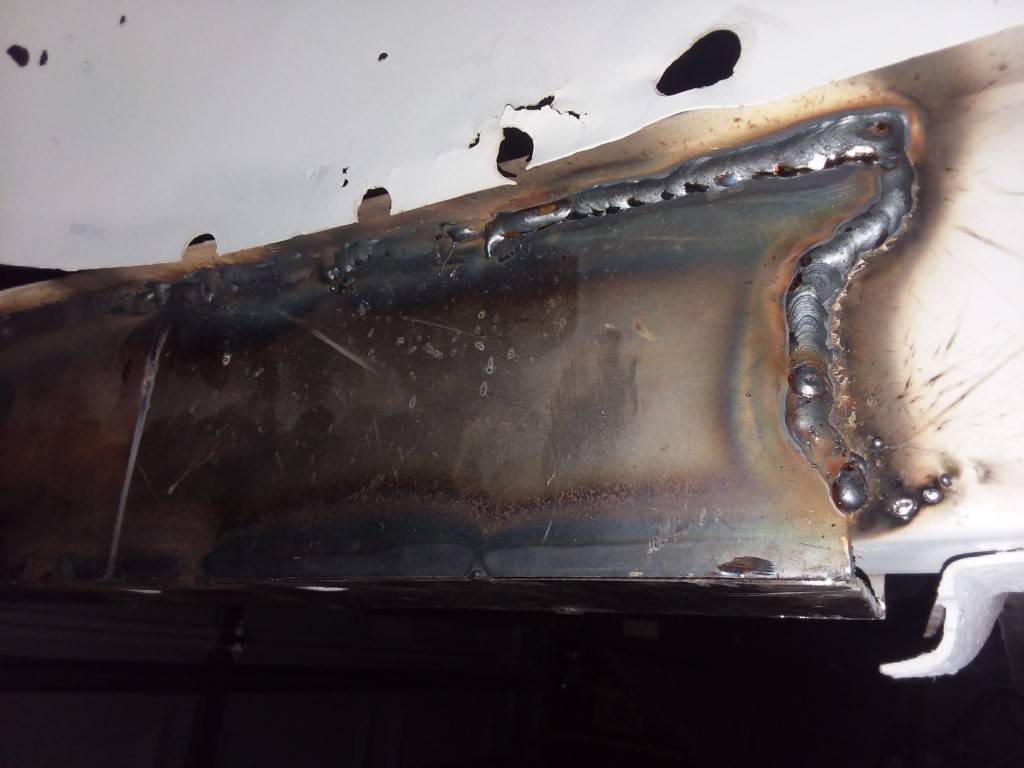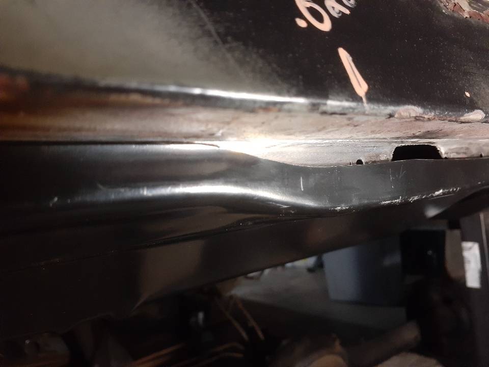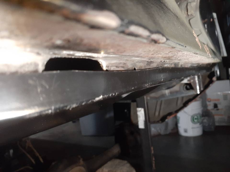 Welding the upper lip of the cap to the frame rail. Other than the ends I kept the seem tucked under the flange that folds over and mounts to the floor pan.