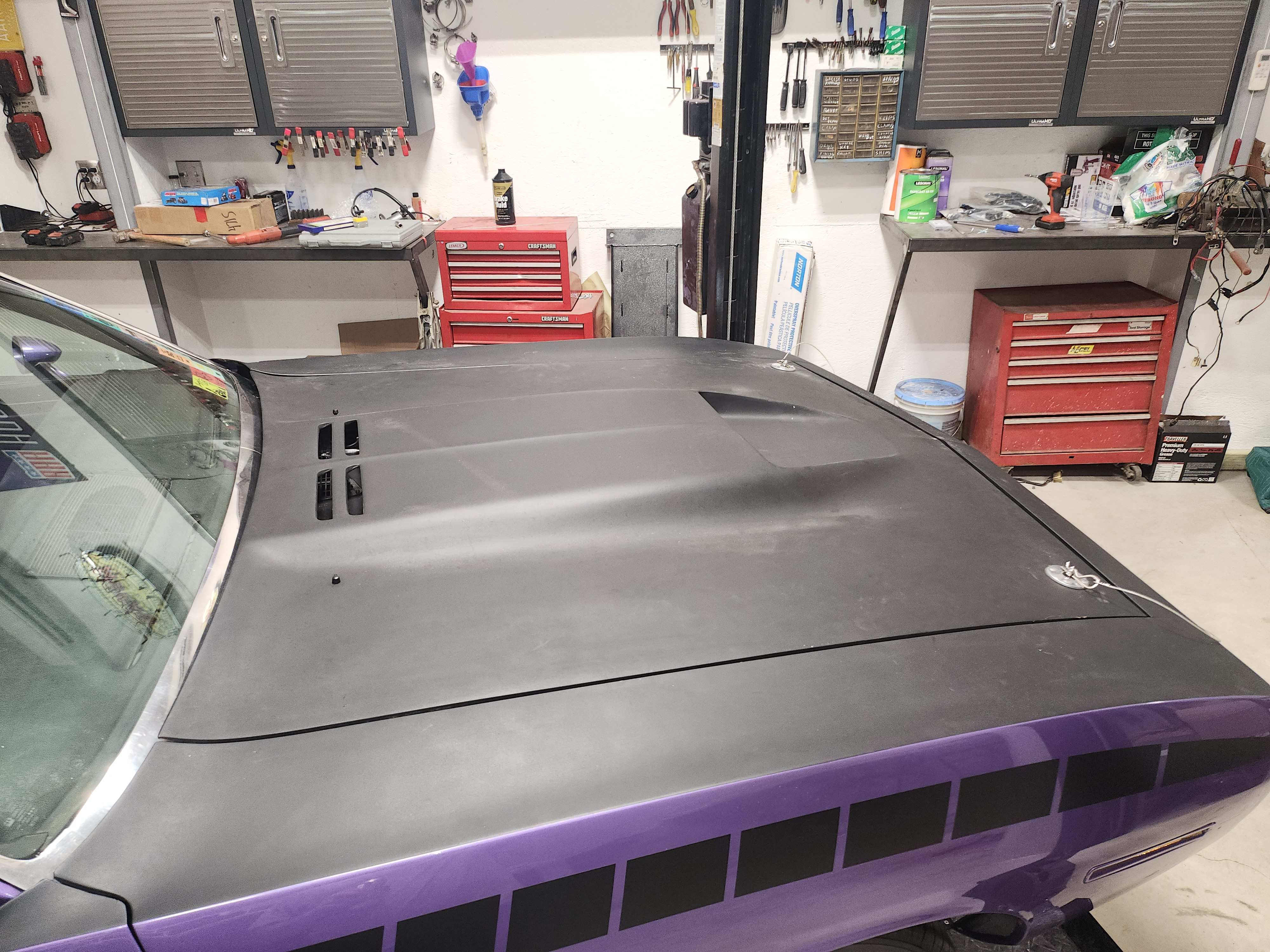 Thank-you. found some fiberglass resin and matting I had for about 7 years. cut some pieces of matting got my first layer down, gonna do one more right on top of the first layer, then some strips down the side to fill in the missing side fiberglass I had to cut out for the hinge mounts. I found this cloth like matting at the local parts store pretty heavy and will use it for the final layer all the way down both side supports, was thinking of a metal support strap in front under the scoop since it is the lifting area of the car, I has some fine stress cracks on each side of the scoop opening.