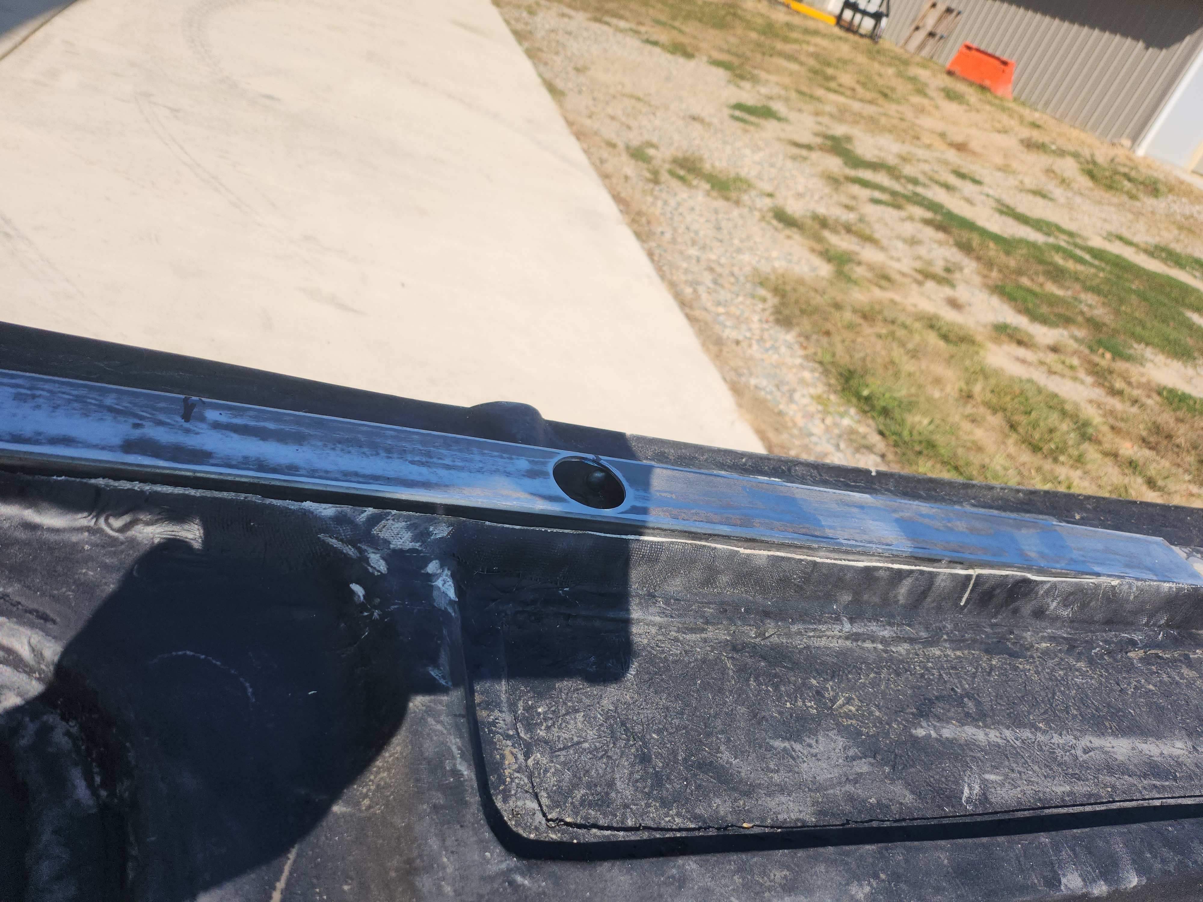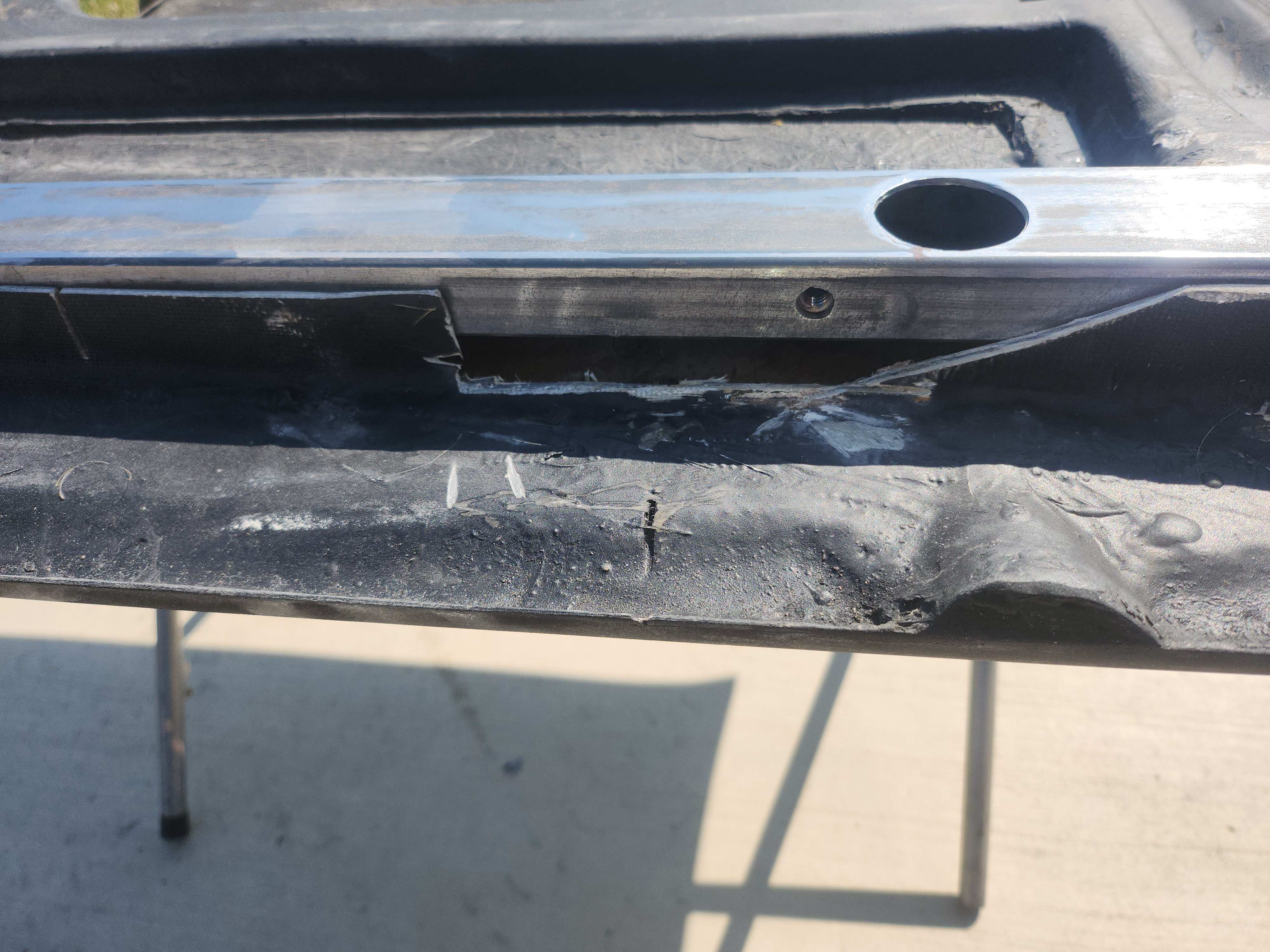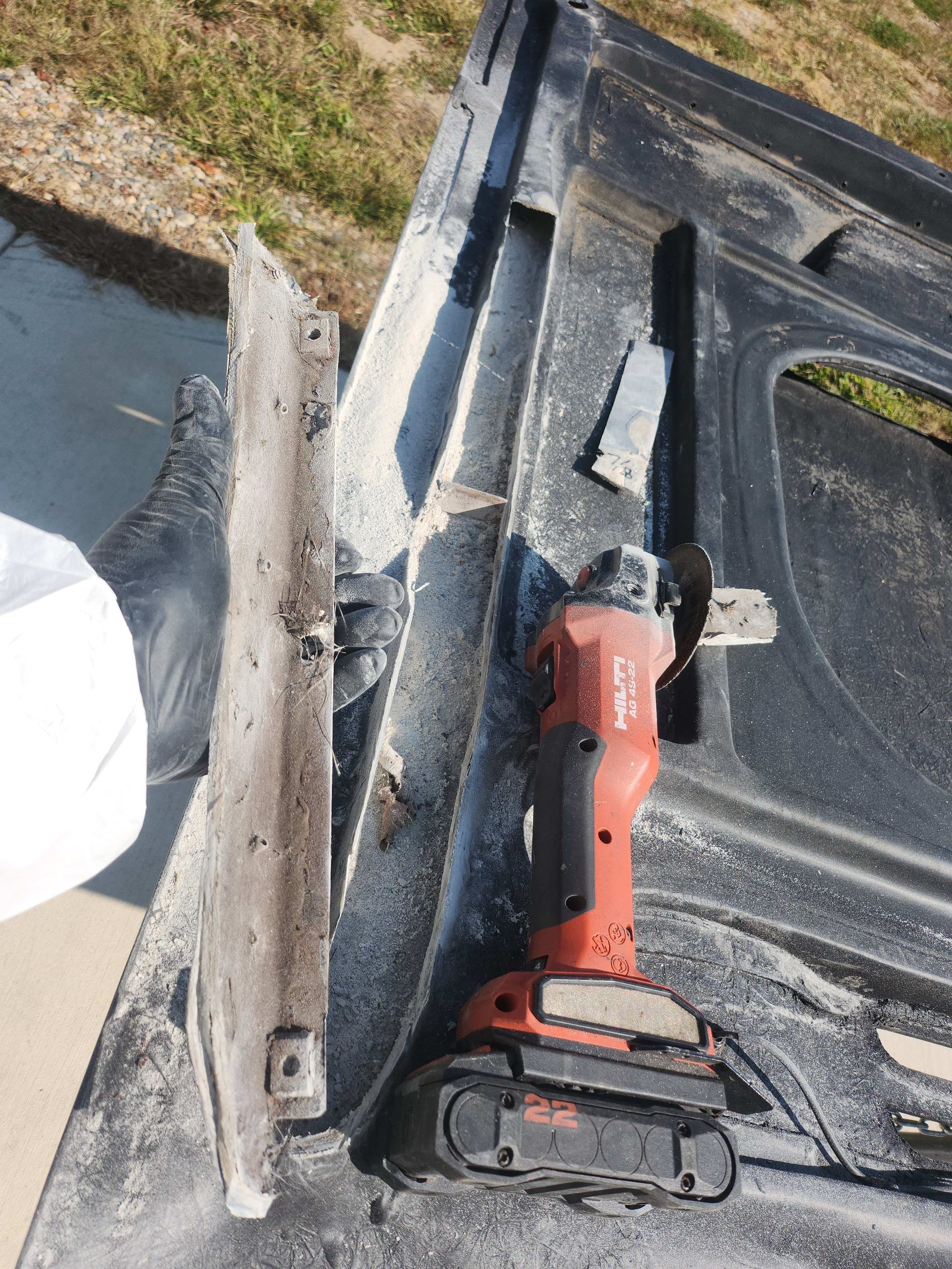 grinding away still, took some 7/16 self tappers and drilled through the 2 lakeys of mesh and drilled in to the metal support, probably overkill but I wanted to see a mechanical fastening to the metal there being its where any flexing may occur. switched over to the air file only had some 180 grit worked pretty good did 4 changes on it. seemed to help cut the long edges in and definately flattened alot of high spots. being that the last guy glassed in over the brace and into the shreaded nylon string area so I lost that texture in those areas. That being said I'll probably brush a light coat over those areas to smooth and even them out, not looking to fill all that in just to make it look somewhat uniform. and remember safety first.