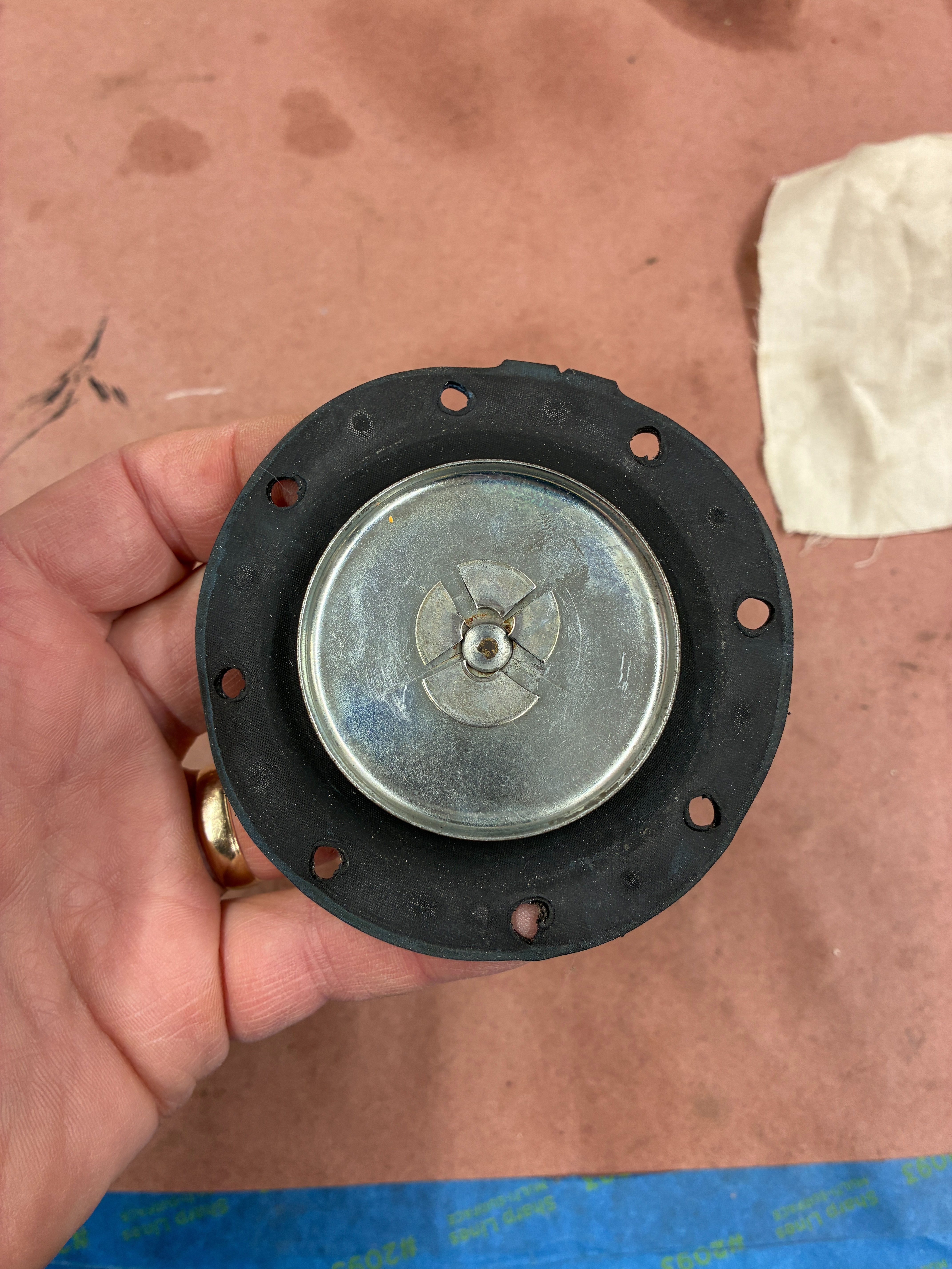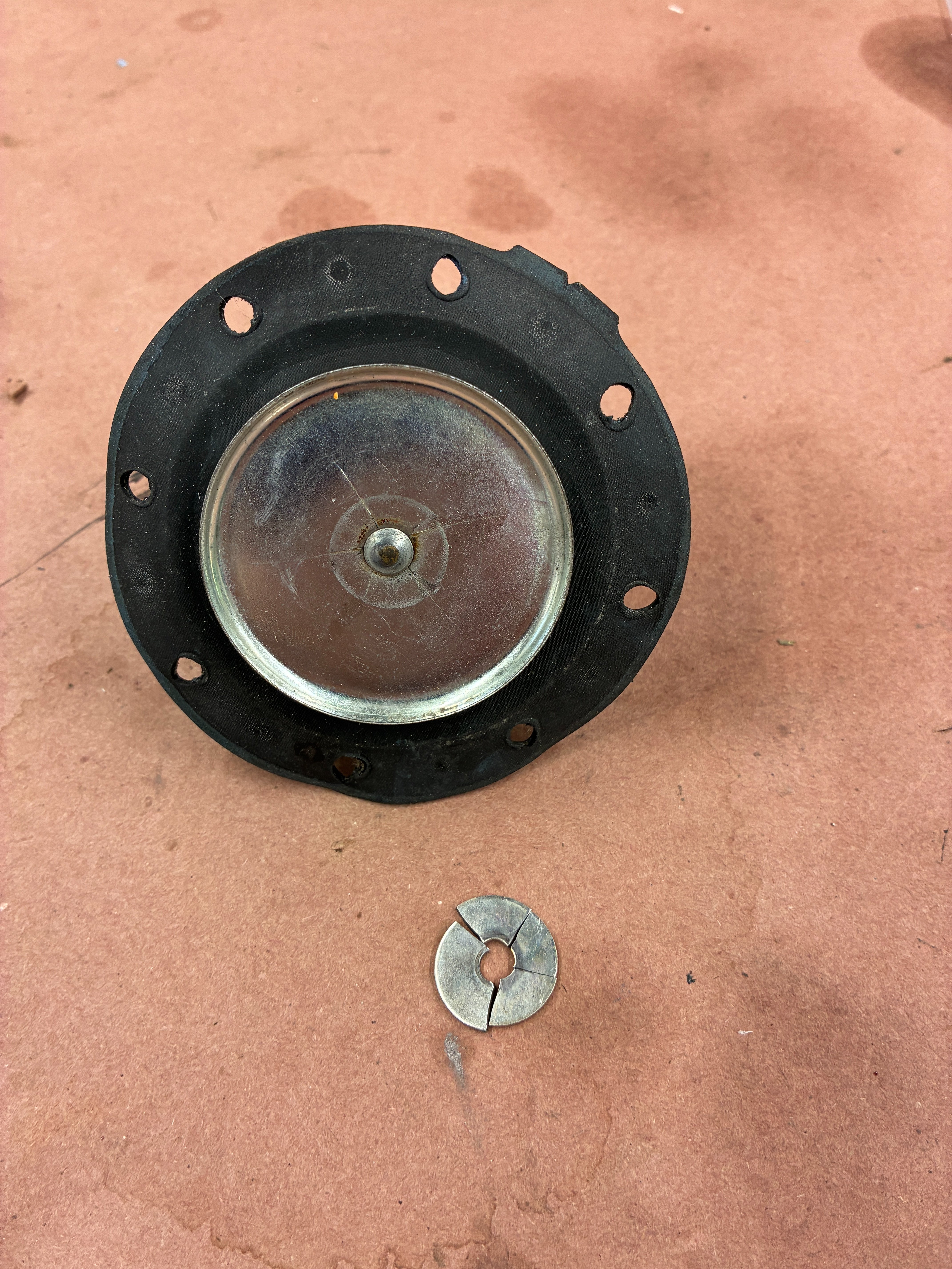 I removed the fuel pump and took it apart. The fuel pump was only a few years old and I wouldn't it to fail so soon. When I took it apart, I found the issue with the diaphragm. The rubber was fine, no cuts or holes. The rubber diaphragm is sandwiched between two metal plated with a washer on the bottom. The washer had broken in four pieces and was sitting in the bottom "bowl". I guess I found the problem. Has anyone seen this?