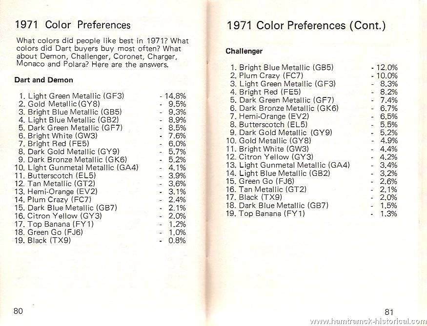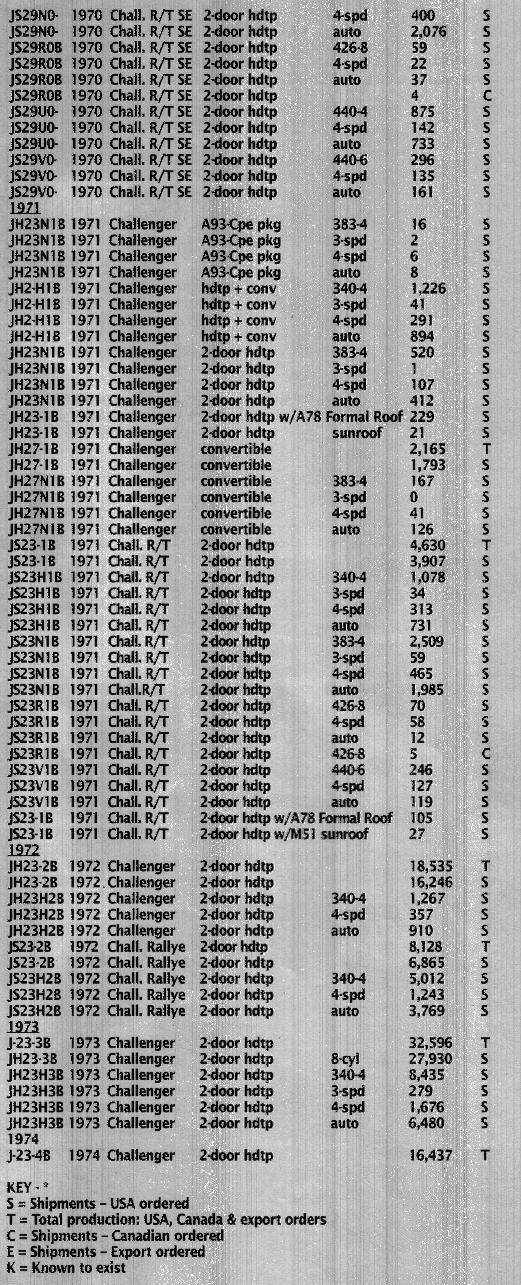 Thanks for the additional clarification. Interesting, I found these documents out on the web but couldn't find one for 1972. Might anyone out there be lucky enough to have found something similar? Curious how many of my Honeydew/Light Gold Challenger Rallyes may have been proportionately been made, as it appears there were about 3,769 of the automatics made...