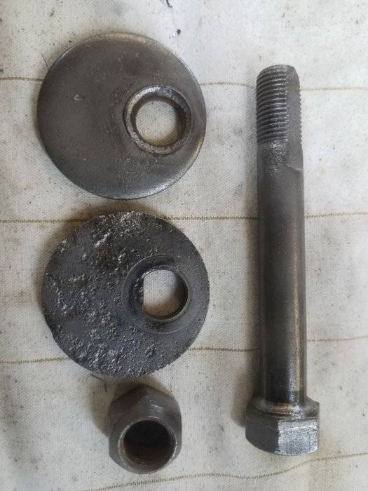 Not to step on anyone's toes here, but the top washer with the round hole should be fuse welded to the cam bolt head. It has spun so now there is no way that the back washer will rotate for adjustment. I guess you could put a couple of small spot welds on the bolt head to washer.