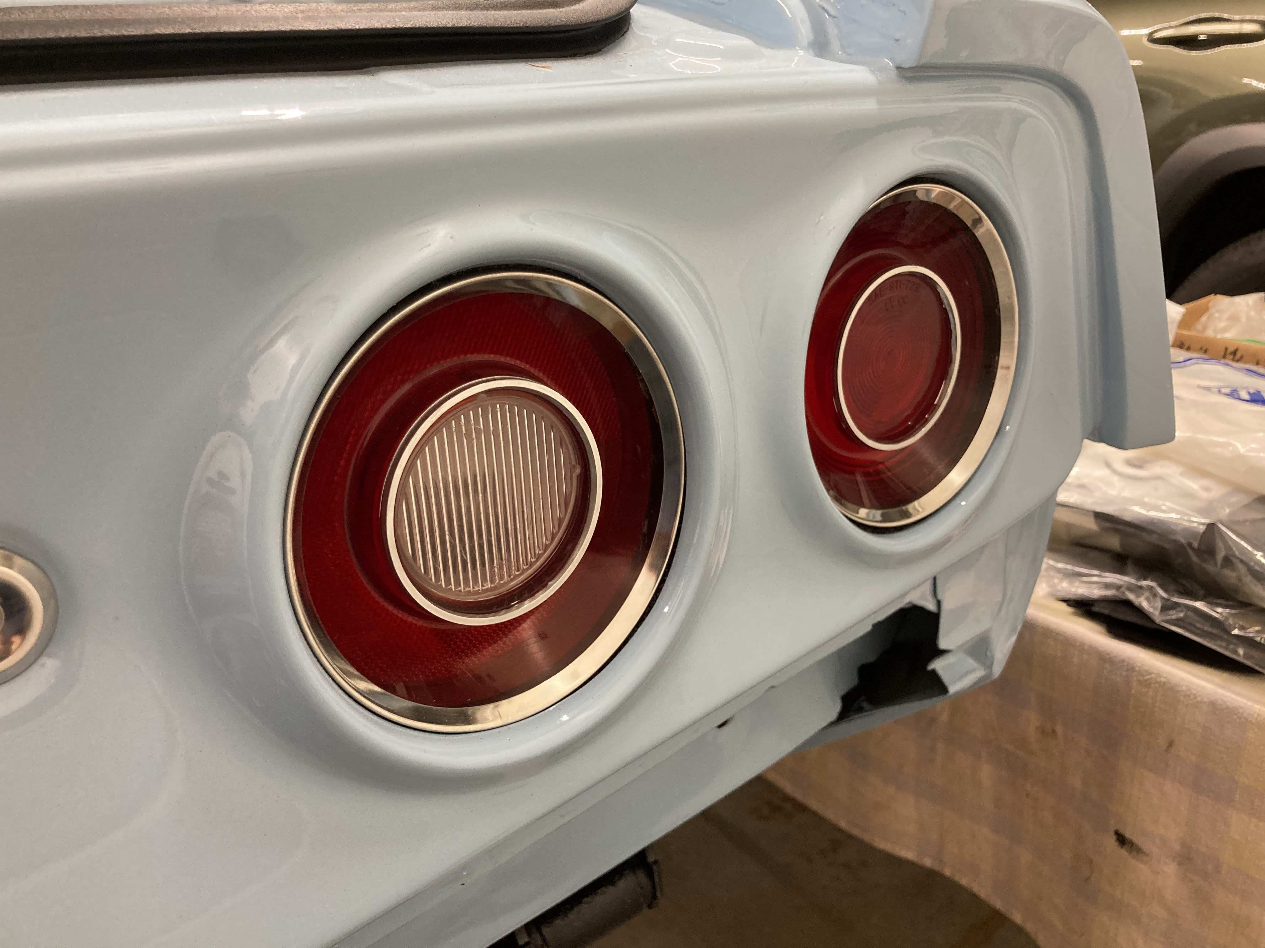 very cool , b1 gotta be a rare color. first i’ve seen one ! my 74 was alpine white from factory w the black stripe. also has green interior which is in poor condition , so we goin w black interior and yet to finalize exterior color choice…when it’s all together, i’d love to see a pic !@hdwrench I had to adjust the mounts slightly by pushing on them to get them closer to the tail light openings. Also I still need to roll the outer lip slightly to make them more round and open them up just a little bit to allow the chrome tail light trim to sit inside the opening. The color is HB-1 (on the fender tag) or B-1 Blue Sky on the PPG paint chip card for 1973. The picture doesn't do the color any justice...