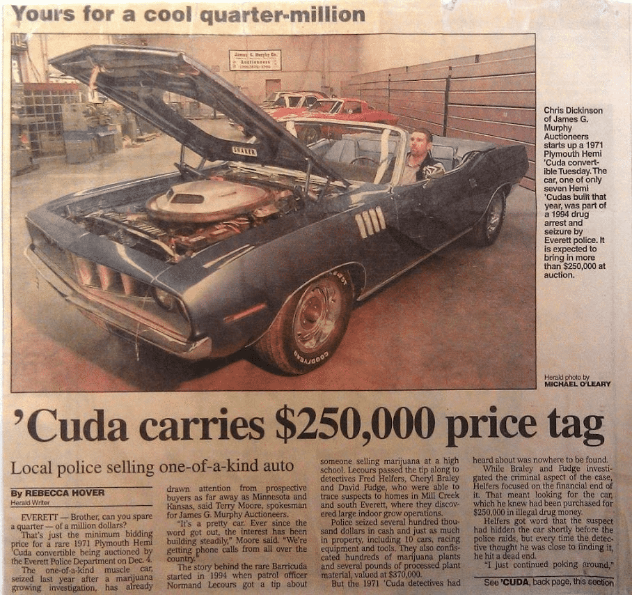 A newspaper clipping I saved from when the Everett PD auctioned off one of only 2 ever 71 4-speed Hemicuda Convertibles.