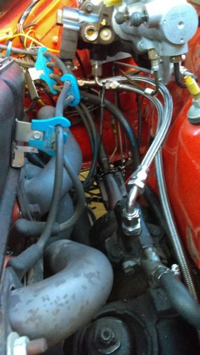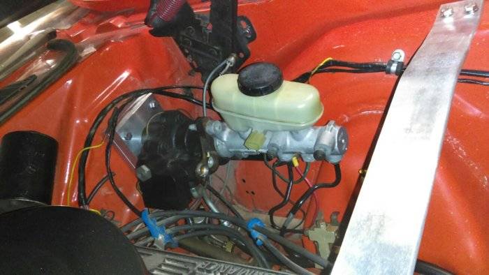 Your situation sounds similar to mine when I "upgraded" to SN95 mustang discs, basically a home brewed 13" system similar to what Dr. Diff sells, serious props to him by the way, he tried to help me sort my junk even though I didn't buy it from him! Anyhow, my pedal felt fine in normal braking, but as soon as you really smashed it it felt like it was bottoming out even though it wasn't, and it wouldn't lock the front or rear brakes. A diesel tech loaned me a hydraulic pressure gauge and I found my line pressure was way low (4-500psi) with a 1 1/8 bore. Swapped to a 1 inch and it got better, but still felt like it hit a hard stop (like it was binding or bottoming out, but it wasn't) under max effort and wouldn't lock the wheels. I've heard of a small bore 7/8 or 15/16 (don't remember which)master, thus increasing pressure, but I couldn't find one. I did have low vacuum, and didn't want to run a booster, so I swapped to hydroboost off a cobra mustang. Best $114 ebay purchase ever for a used master and booster, and now she has the best brakes I've ever felt. I never figured out what caused the hard stop pedal feel, just know I could "bounce" the pedal on that stop, but if I cracked a front or rear bleeder it would drop to the floor. These are some pics of it going in, I changed it up a little from these pics, but it will give you an idea of how it fits.